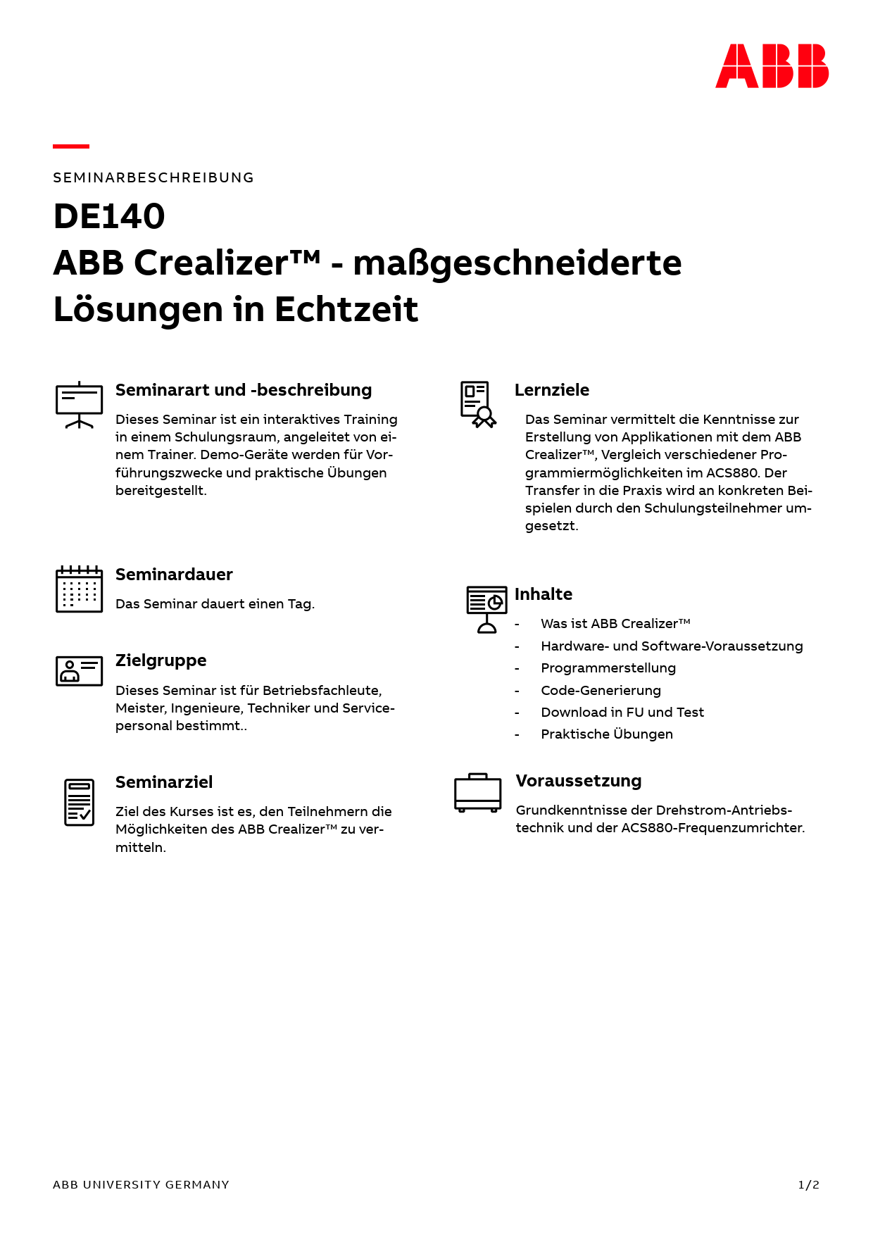 | Kurs | DE140 - ABB Crealizer - maßgeschneiderte Lösungen in Echtzeit |