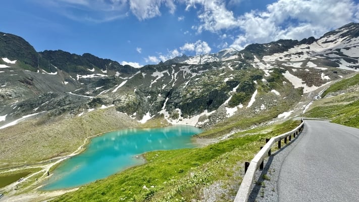 An unserem Dreiländertag führt unsere Route ein paar Kilometer durch die Schweiz und dann in Italien bis hinauf zum Reschenpass, wo wir den Alpenhauptkamm überqueren. Vom Reschensee aus geht es fast nur noch bergab bis zu unserer Unterkunft in Mals.