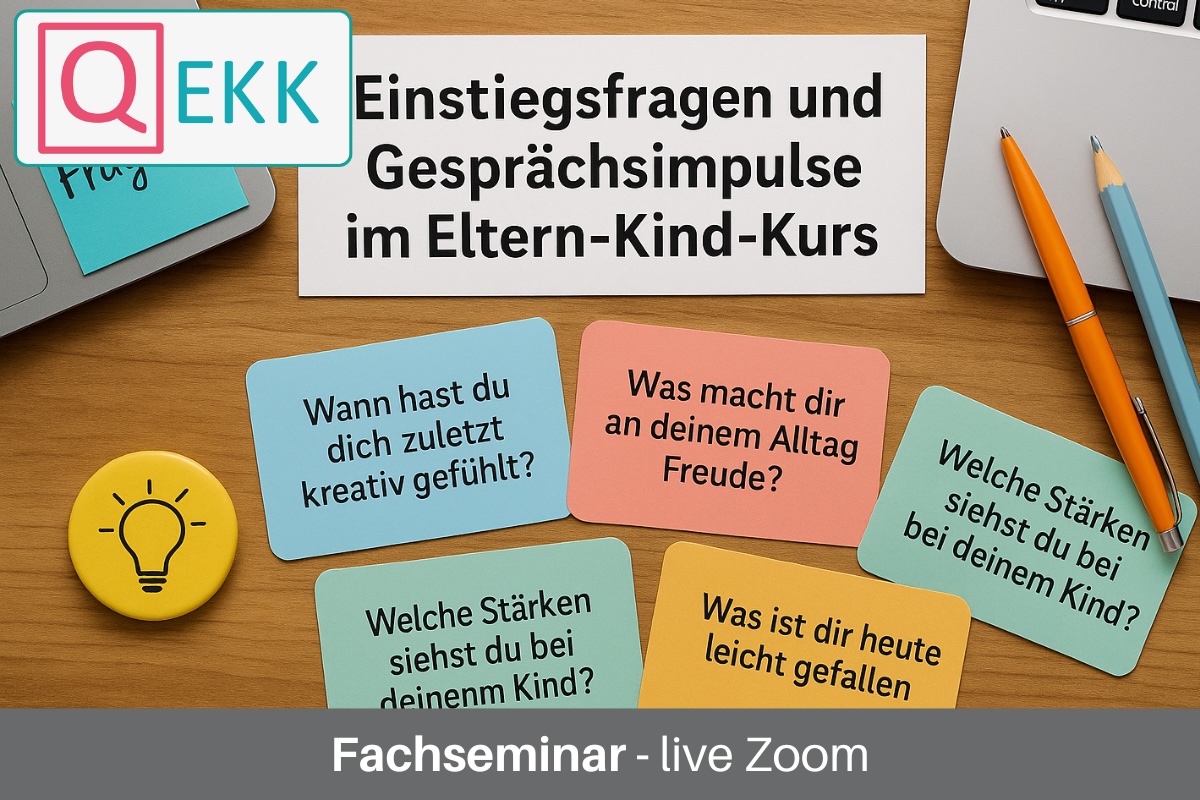 In manchen Eltern-Kind-Kursen entwickeln sich Gespräche ganz von selbst – in anderen fällt es den Teilnehmenden schwerer, miteinander in Kontakt zu kommen. Das Seminar bietet eine große Auswahl an Einstiegsfragen und Gesprächsimpulsen, die helfen, Brücken zwischen den Eltern zu bauen und ein offenes, vertrauensvolles Miteinander zu fördern. Zusätzlich werfen wir einen Blick darauf, welche Gesprächsblockaden im Kursalltag entstehen können. Wer diese erkennt und versteht, kann sie leichter lösen und Eltern sicher durch herausfordernde Situationen begleiten. Wie in allen QEKK-Fachseminaren gibt es auch hier viel Raum für Austausch, eigene Erfahrungen und Anregungen aus der Praxis.