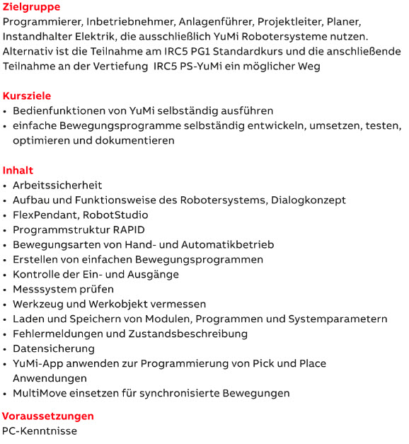 | Kurs | IRC5-YuMi1 YuMi Grundlagen |