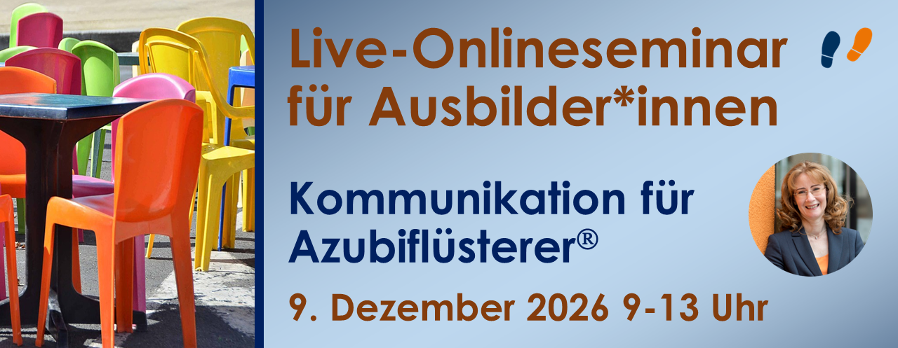 | 1 | 09.12.2026 | 09:00 – 13:00 | Frau Sabine Bleumortier | online | Kommunikation für Azubiflüsterer |