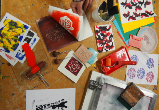 Komm gerne vorbei! Wir zeigen dir verschiedene Drucktechniken auf unterschiedlichen Materialien – etwa, wie man auf Karten oder T-Shirts druckt und eigene Linol-, Holz- oder Moosgummistempel herstellt.