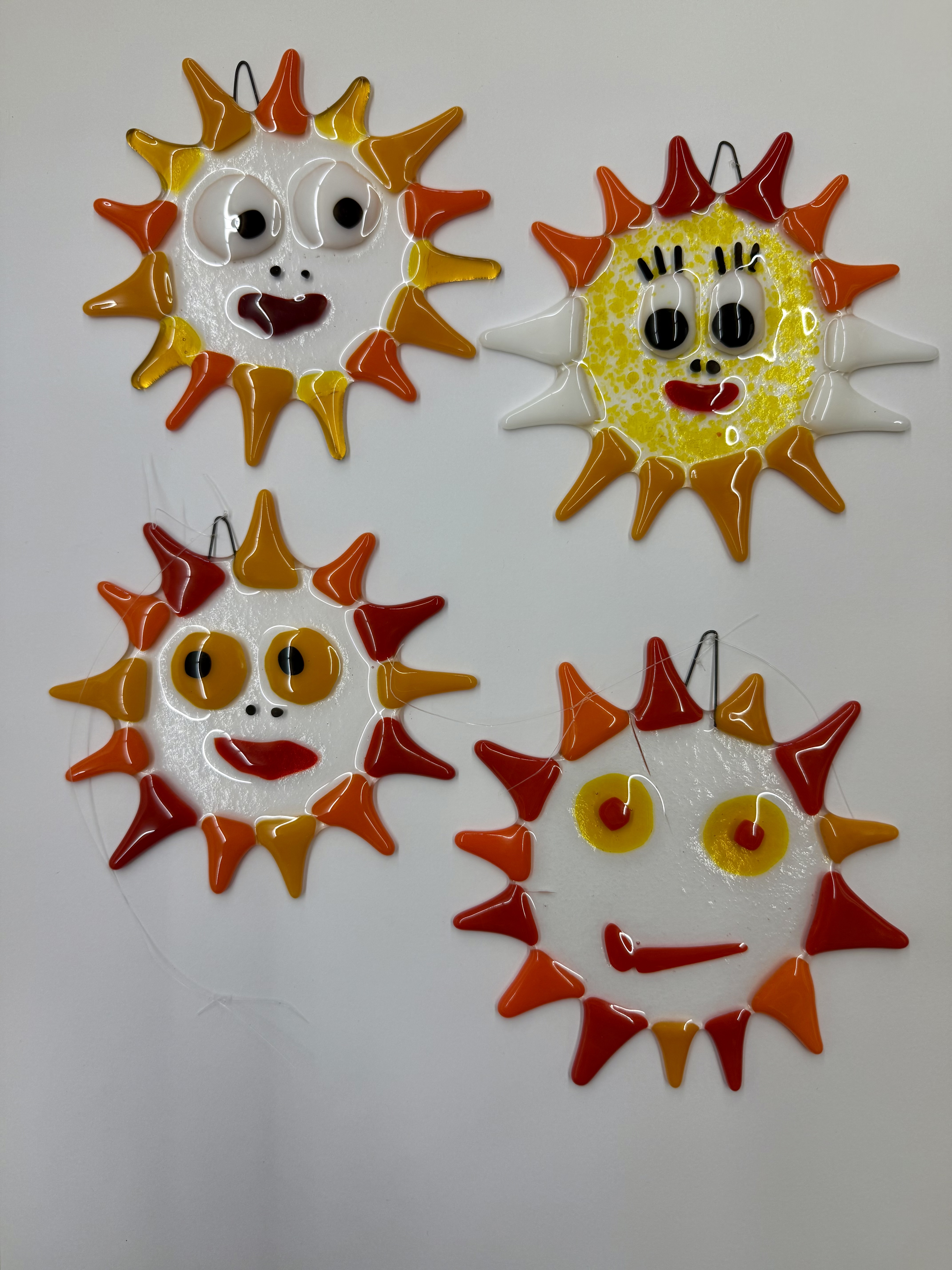 Aus farbigen Glasteilen werden lustige Sonnen zusammengesetzt und mit diversem Glasmaterial dekoriert. Grösse ca. 15 cm im Durchmesser.