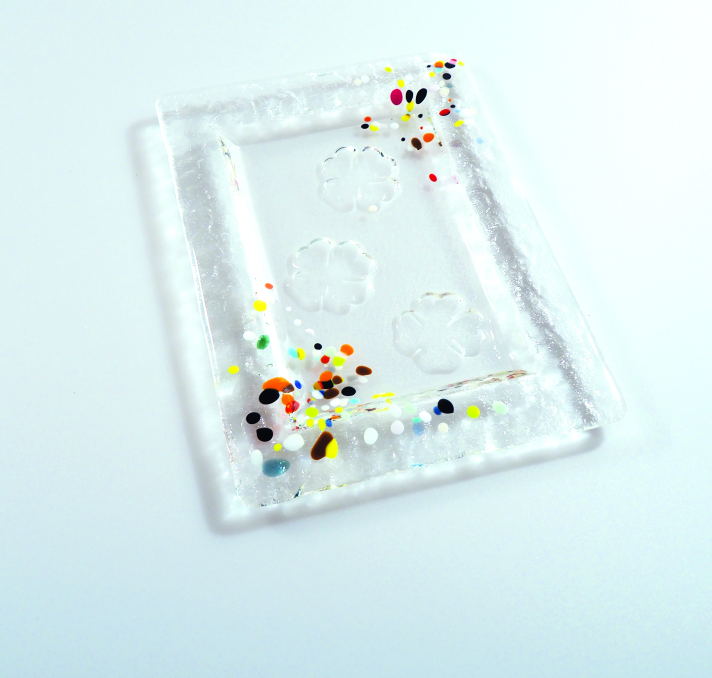 Eine klare Glasform kannst du mit kleinen, farbigen Glasteilchen dekorieren – sei es ein Muster, ein Motiv oder ein kleines Bild. Beim Fusing-Brand verschmelzen die Farbglasstückchen mit dem Klarglas, wodurch eine Vertiefung und damit die charakteristische Schalenform entsteht.