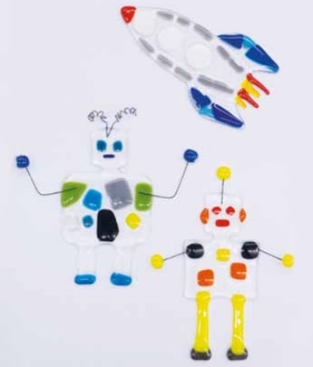Kreiere mit verschiedenen Glasteilen einzigartige Raketen und/oder Roboter und verziere sie mit vielfältigem Glasmaterial.