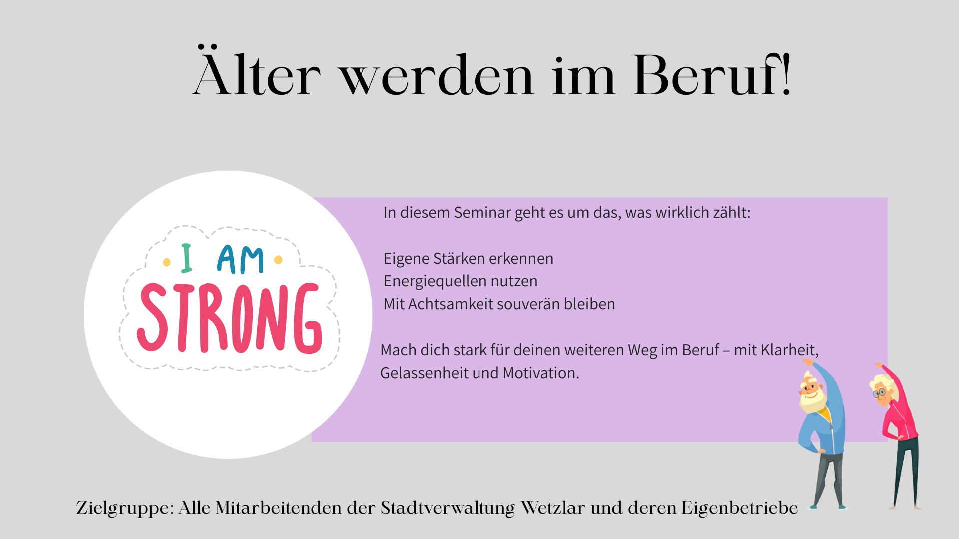 | Seminar | Älter werden im Beruf Motivation und Leistungsfähigkeit durch Achtsamkeit erhalten |