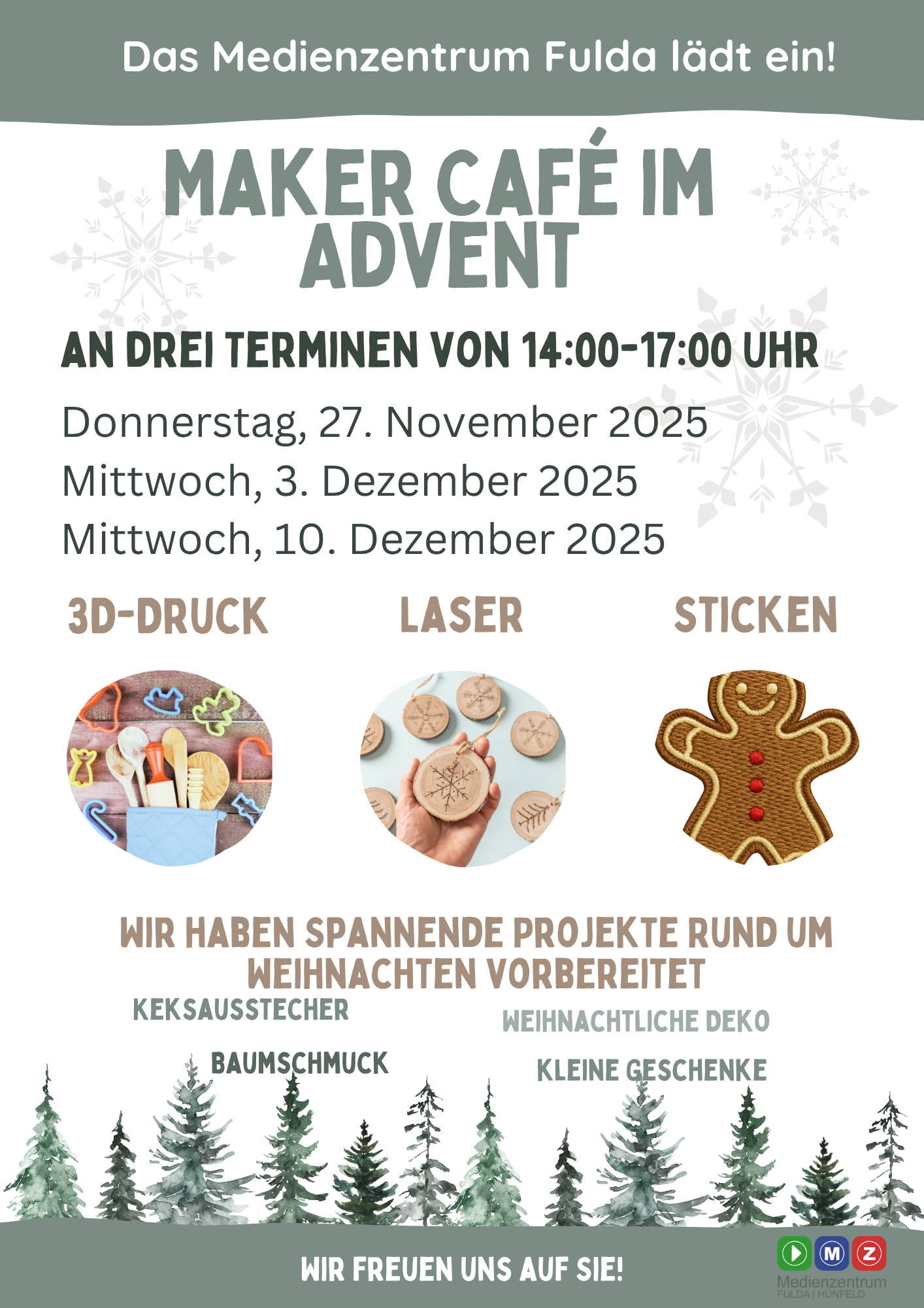 Im gemütlichen Rahmen des Makerspace Cafés haben Lehrkräfte die Möglichkeit, kreative Weihnachtsprojekte mit moderner Technik umzusetzen. Im Medienzentrum Fulda stehen dafür Lasercutter, 3D-Drucker und Stickmaschine zur Verfügung.