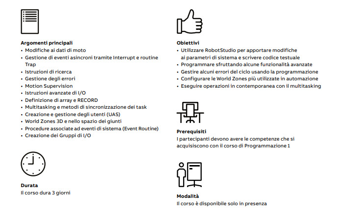 Il corso di Programmazione 2 fornisce ai partecipanti nozioni avanzate e approfondite di programmazione in linguaggio RAPID, necessarie per chi programma sistemi robotizzati.